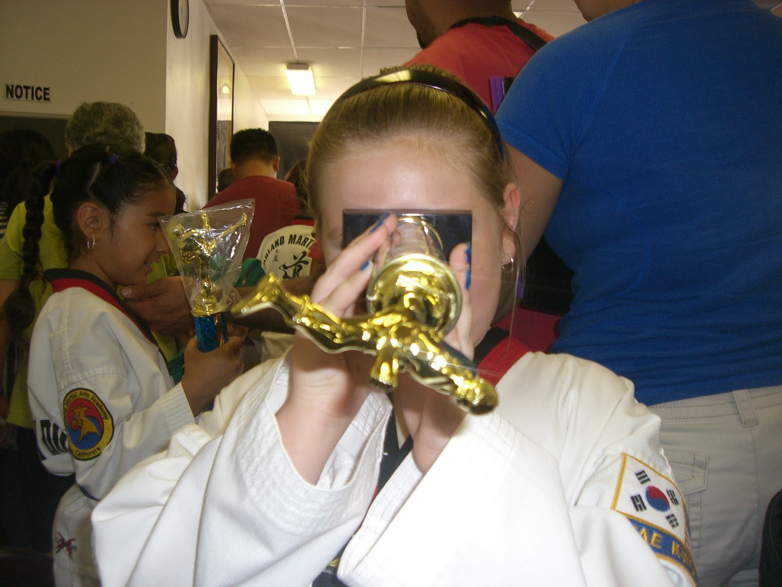 My youngest did go for her next belt (which really wasn’t all that different from her last test) on Saturday so she is now a brown 2 which means she has a brown belt with 2 red stripes on it. Her next belt will be red. She did a pretty good job and was happy with her test. She passed! That was the important part. 🙂 Here she is showing off her trophy. lol
