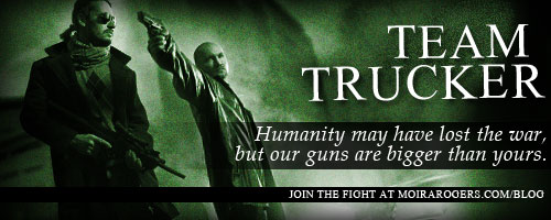 This post is part of Moira Rogers’s Post-Apocalyptic Trucker vs Outcast Showdown. A comment on this post will enter you to win your choice of a NOOK Simple Touch, or a Kindle Touch or Kobo Touch with special offers. For rules, details on more ways to enter or information on how to pick your own side, visit the contest page at Moira Rogers’s website.