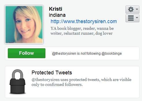 *insert sad face here* That’s right, folks, I can no longer see Kristi’s tweets and she will no longer get my @replies to her. Please wait while I take a minute to compose myself and dry my tears.