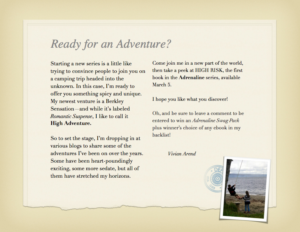Today we have paranormal and contemporary romance author Vivian Arend here to share with you her one of her many adventures (she’s a world-traveler). Viv is celebrating her upcoming release, High Risk (Berkley, March 5), the start of a new series about an elite search-and-rescue team based in Alberta.
