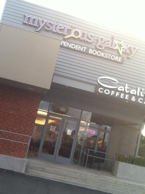 I’ve only been inside the Mysterious Galaxy bookstore once before but I don’t remember it being as awesome as it was last night.  You walk into the cafe first and there are tables and cool chairs for people to hang out at.  The bookstore is right past the cafe and it’s spacious, with room to walk and loads of books on display.  It really is a delightful hangout for book lovers.  I will definitely be back.